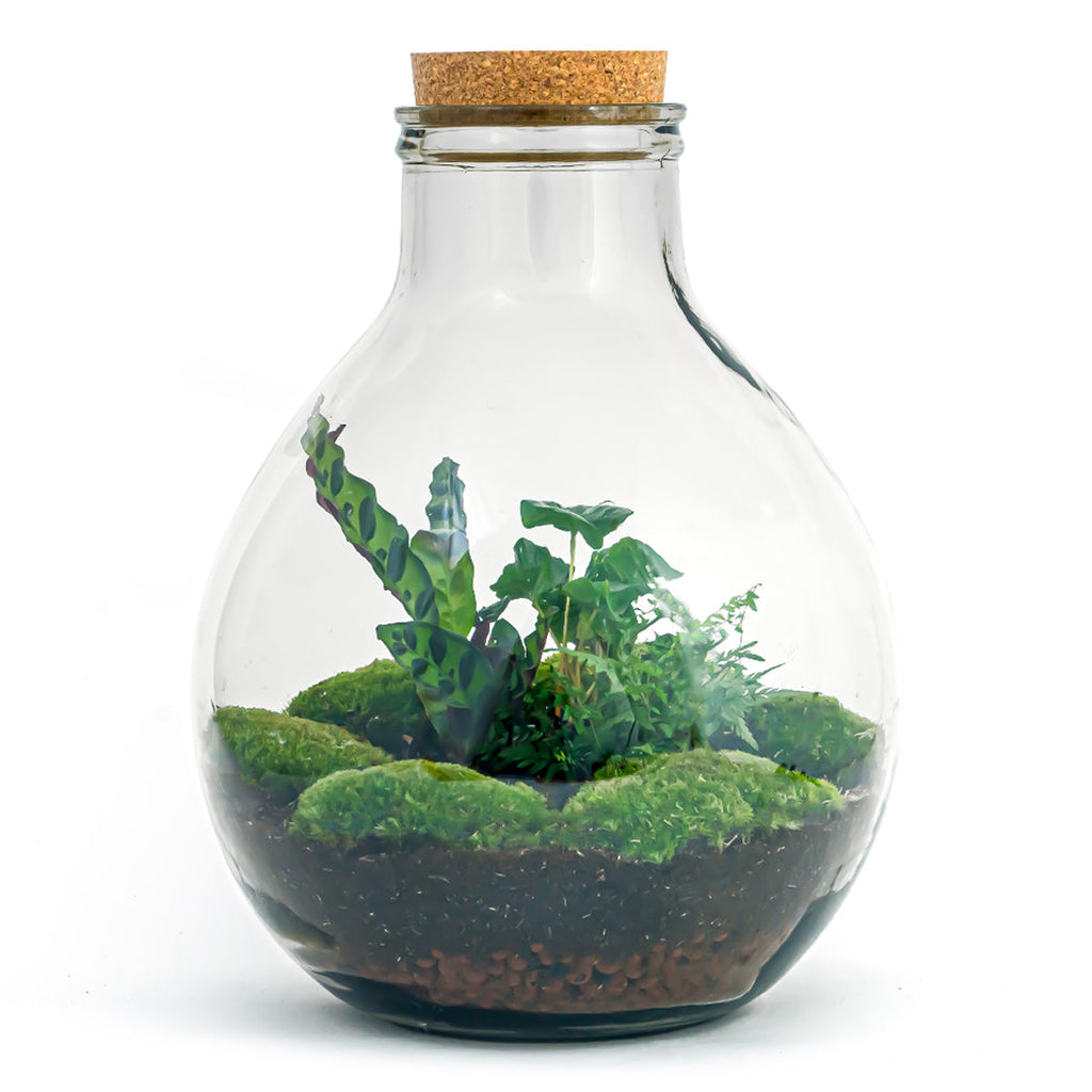 DIY Terrarium with green plants in a bottle With a plant terrarium from Trendhero, you get a real eyecatcher in your home or office. You do not need to have a green thumb or plant knowledge to enjoy this beautiful piece of nature in your home or office. Our plant terrariums are completely self-sufficient and watering is often only necessary a few times a year. Size without light: Ø 31 cm ↑ 39 cm Size with light: Ø 31 cm ↑ 46 cm A plant terrarium looks beautiful, is self-sufficient and sustainable. Moreover, it is also fun to put together your own piece of nature. A lovely Do-It-Yourself (DIY) kit with everything you need to put together your own plant terrarium. Get to work quickly to enjoy your own mini-jungle! What’s in the package? Terrarium (with or without LED light) Plants; Fittonia Calathea Coffea arabica Plenty of fresh green moss Hydro pellets Activated carbon Terrarium potting soil Step-by-step plan for creating your closed terrarium Care tips Do-It-yourself packageOur plant terrariums come as a Do-It-Yourself (DIY) package. Upon receipt, you will assemble your new green friend in no time using the easy 5-step plan. But don't worry, everything you need to know about your plant terrarium is explained to you in 5 simple steps. Sustainable patch of greenOur plants and mosses grow on a bed of love at our nursery. They are selected with the greatest care and undergo a quality check in our own plant workshop. So you can always assume that our plants and mosses are of the best quality and have taken the shortest possible route. So you can be sure of making a sustainable choice and we guarantee you the best quality you can enjoy for years to come. Gift tipWe understand that you would prefer to keep our plant terrariums yourself, but they are also great fun to give as gifts. A family member, friend, colleague, business associate, acquaintance or maybe even the teacher: you will make them all equally happy.