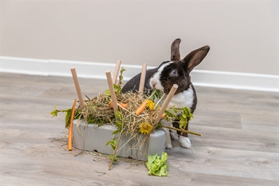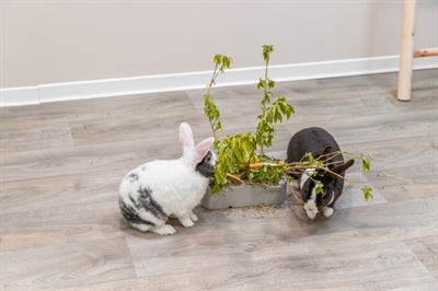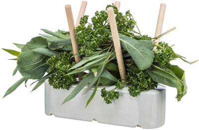 The Trixie Feeding Rack Ceramic / Wood Gray 26 x 17 x 23 cm is a hay rack for rabbits and rodents, with wooden rods that can be replaced by branches. Hay tastes best when it's fresh! Rabbits and rodents often have a tendency to flatten their hay, after which it is no longer eaten. Prevent that with this handy Trixie hay rack. This rack consists of a ceramic base with wooden sticks, between which you can offer hay, grasses and herbs. Extra nice is that the rods are loose: for extra nibbling fun you can easily replace them for branches that can be gnawed on, for example.