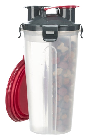 De Trixie Waterfles / Voerfles Inclusief Reisbak Kunststof / Siliconen 11X11X23 cm 2X350 ml is een fles met voer- en waterreservoir, ideaal voor op reis of lange wandelingen. De kunststof fles is in tweeën gedeeld, zodat er één compartiment is voor voer en één voor water. Door de aparte openingen kun je zelf kiezen welk compartiment je wilt legen. De fles komt met een invouwbare bak van siliconen waar je het water of het voer in kunt aanbieden. Met de haak hang je hem eenvoudig aan jouw tas en gaat hij ook mee op reis, fietstochten of lange wandelingen. Voor gemakkelijk schoonmaken kun je ook het gehele deksel verwijderen.