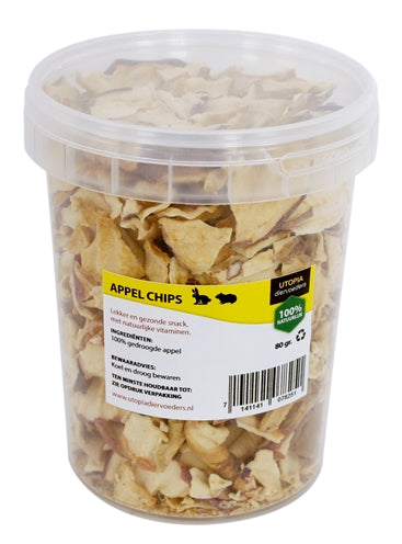 The Utopia Apple Chips 80 gr are healthy snacks for your rabbit or rodent, 100% natural and very tasty. Fruit is an important part of the diet of rabbits and rodents. So treat your animal now with this delicious dried fruit snack from Utopia! These tasty dried apple slices are deliciously fragrant and tasteful and made without artificial additives. So pure fruit, completely natural! The sweet taste of the apple will soon make it your animal's favorite snack. Give it to your animal as a reward, as a surprise between the hay or simply through the daily feed!