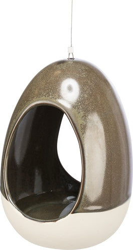 L'abreuvoir suspendu en céramique Trixie crème/vert forêt 12 x 12 x 16 cm est un abreuvoir spécial pour oiseaux, en céramique et à accrocher, par exemple, dans un arbre ou sur une clôture. Trouver de l'eau n'est pas toujours facile pour les oiseaux sauvages dans les zones densément peuplées. Soutenez les oiseaux de votre jardin avec ce bol à boire pratique de Trixie. Cet abreuvoir a été conçu en collaboration avec le Weltvogelpark Walsrode, afin qu'il puisse être utilisé de manière optimale par les oiseaux du jardin. L'abreuvoir est de forme ovale avec une ouverture au milieu, de sorte que l'eau soit accessible en toute sécurité pour les oiseaux et soit protégée de la saleté et des feuilles qui tombent. Les oiseaux peuvent s'asseoir sur le bord élevé pour boire. L'abreuvoir est conçu pour être suspendu et équipé d'un fil de fer robuste avec boucle, vous pouvez donc l'accrocher n'importe où dans votre jardin ou sur votre balcon.