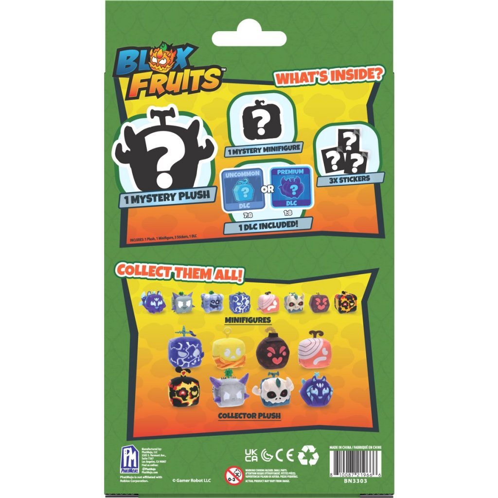 Verzamel mysterieuze knuffels zoals de gewone Bomb, legendarische Quake en mythische Kitsune. Breid je Blox Fruits-collectie uit met mysterieuze minifiguurtjes zoals de gewone Spike, legendarische Pain en mythische T-Rex. Elke Mini Bundle bevat 6 verschillende items: 1 mysterieuze verzamelknuffel, 1 mysterieuze minifiguur, 3 stickers en 1 DLC-code. Daarmee is het een must-have voor alle Blox Fruits-fans. Geschikt voor kinderen vanaf 6 jaar.