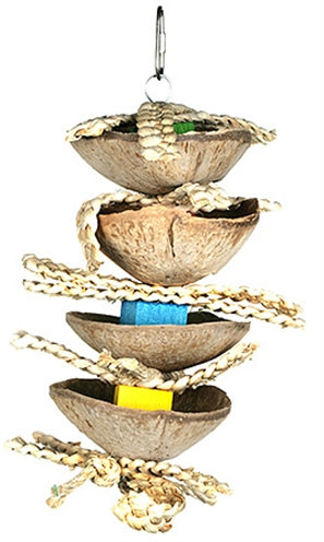 Gemaakt van natuurlijke materialen, zoals kokosnoot schelpen, hout en touw. Met haak om het speelgoed eenvoudig op te hangen in de kooi.