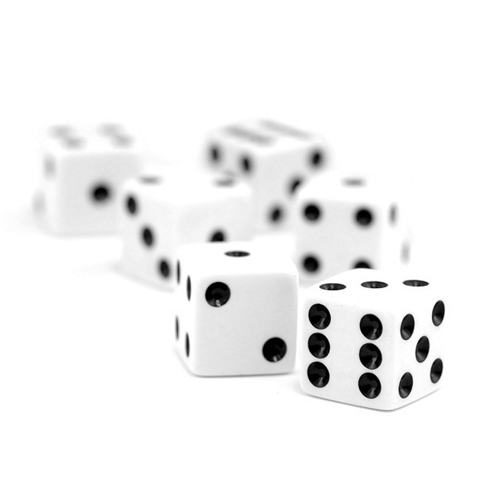 6-zijdige dobbelsteen van 16 mm. Verpakt per 6 stuks in zacht plastic doosje. Kleur ivoor wit.