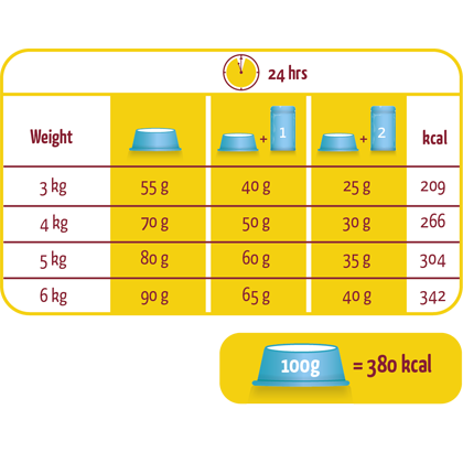 Eiwit 32,0%, Vetgehalte 10,0%, Ruwe celstof 2,0%, Ruwe as 8,0%, Calcium 1,1%, Fosfor 1,0%, Taurine 0,2%