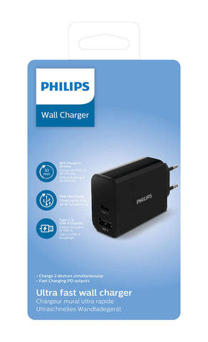 Maak snel en efficiënt laden mogelijk met de Philips High Power Dual Charger. Deze compacte oplader levert 30W vermogen verdeeld over twee poorten en biedt tegelijkertijd USB-A en USB-C opladen. Met een combinatie van 1 USB-A poort en 1 USB-C poort kun je twee apparaten tegelijk opladen, waardoor je minder kabels en minder laadruimte nodig hebt. Het slimme ontwerp houdt je bureau of nachtkastje netjes terwijl je apparaten weer volledig opgeladen zijn. Belangrijkste kenmerken Totaal vermogen van 30W voor krachtig laden van meerdere apparaten tegelijk 1 USB-A en 1 USB-C poort om diverse apparaten te ondersteunen Compact en draagbaar ontwerp voor thuis, op kantoor of onderweg Breed compatibel met smartphones, tablets en andere USB-aangedreven apparaten De Philips High Power Dual Charger 30W met 1 USB-A en 1 USB-C poort biedt betrouwbare laadprestaties in een handig formaat. Investeer in een praktische oplossing die je laadervaring vereenvoudigt en je apparaten snel weer op 100% brengt.