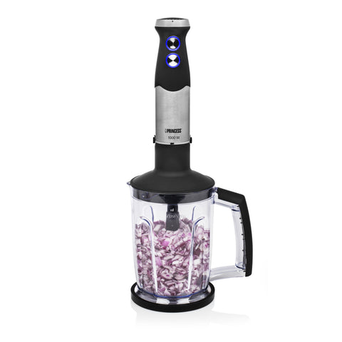 De zeer krachtige en sterke Princess staafmixer met vierbladsmes is voor iedereen die graag veel pesto, soep en milkshakes maakt. De mixer heeft een vermogen van maar liefst 1000 Watt. Dankzij de vijf standen pas je de kracht van de mixer aan op de ingrediënten en blend je alles binnen seconden fijn. Het rubberen handvat met daarin de twee verlichte instellingsknoppen ligt ergonomisch zeer goed in één hand. Daarnaast is de snelheid makkelijk af te lezen door de blauwe indicatielampjes bovenop het handvat. Het bedienen van een staafmixer was zelden zo eenvoudig. De Princess Staafmixerset heeft een verwijderbare roestvrijstalen XL staaf met vier messen en pureert soepen en fruithapjes zeer glad dankzij het zeer krachtige vermogen van 1000 Watt. Bij de staafmixer ontvang je ook een maatbeker van 0.8 liter waarin je mayonaise, pesto en fruithapjes kan maken, een klopper voor slagroom en een XL hakmolen voor pesto en kruiden. De staafmixer kan makkelijk uit elkaar gehaald worden en het pureergedeelte en de accessoires kunnen in de vaatwasser. Schoonmaken is dus snel gedaan. Op alle producten van Princess ontvang je 24 maanden garantie.