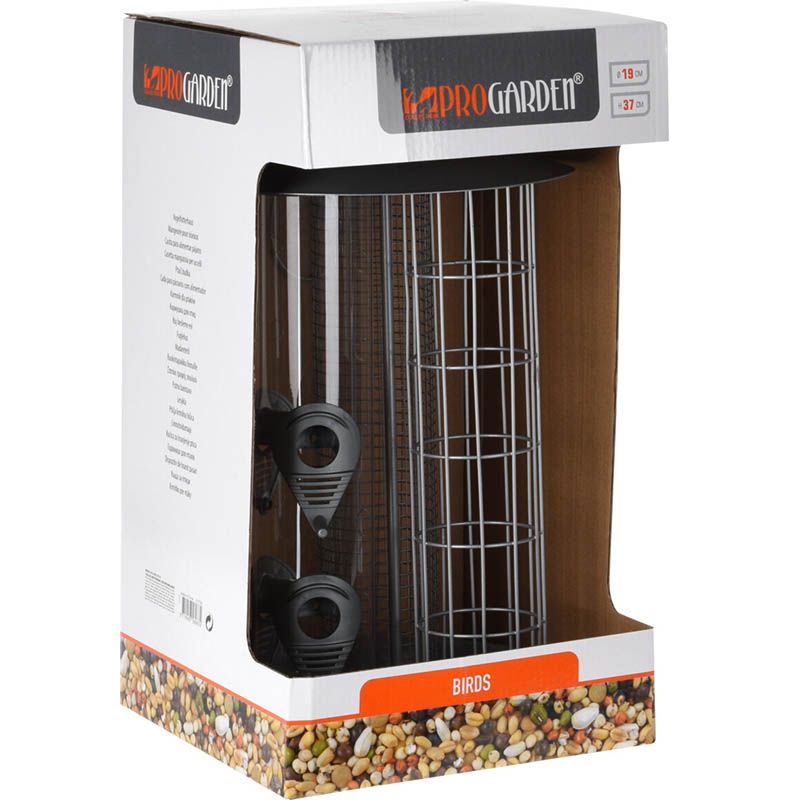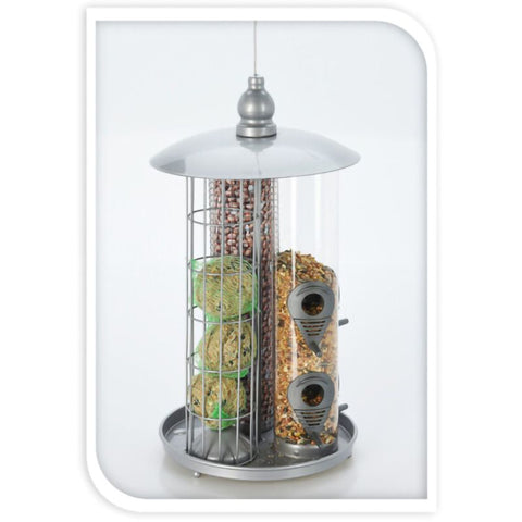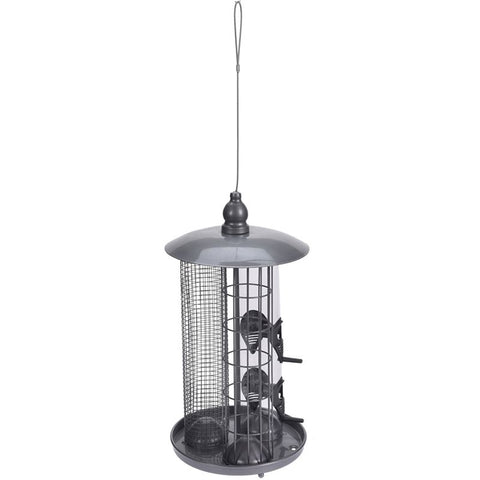 Super leuke metalen vogelvoerhouder die gevuld kan worden met mezenbollen, noten en strooivoer. Het is een groot model van maar liefst 37 cm hoog en makkelijk op te hangen.
