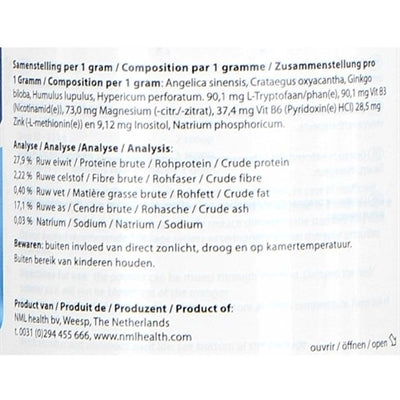 Samenstelling: per 1 gram, Dong Quai, Hop (Humulus lupulus), Japanse notenboom (Ginkgo biloba), Meidoorn (Crataegus oxyacantha), Sint-Janskruid (Hypericum perforatum), 90,1 mg L-Tryptofaan, 90,1 mg Vitamine B3 (nicotinamide), 73,0 mg Magnesium (als -citraat), 37,4 mg Vitamine B6 (als pyridoxine HCl) 28,5 mg Zink (als -L-methionine) en 9,12 mg Inositol. Een verdunning van Natrium phosphoricum.